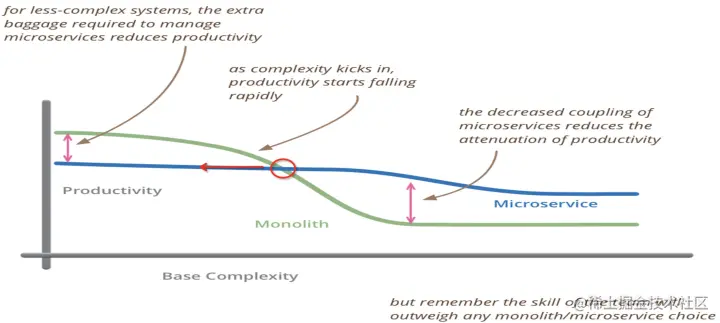 由于微服务技术门槛和复杂度导致采用成本比较高,早期研发人数仅 10 人左右,子系统超过 5 个才比单体架构效率更高,但是随着微服务技术成熟,微服务和单体应用效率发生变化的点左移,目前研发人数 5 个人左右,子系统超过 3 个做微服务都能获得更高的性价比,并且随着 Serverless 推进,一个 Fuction 就是一个服务,使用场景在不断扩大。