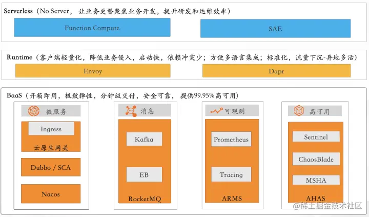 微服务架构分层逐渐形成,后端 BAAS 化,客户端轻量化,业务侧 Serverless 化,让业务更加聚焦业务开发,进一步提升研发效率。