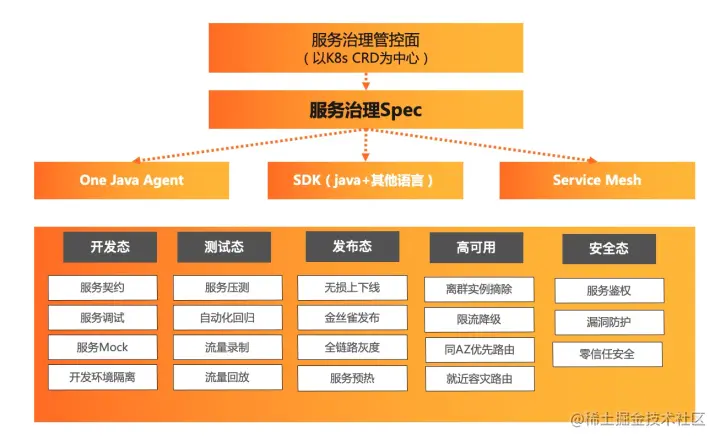 服务治理数据面将会逐步下沉,与业务逻辑逐步解耦,透明的实现治理技术的演进和升级。在数据面的形态上来看,存在多种形态并存,针对 Java 语言,以 Java Agent 为形态的的服务治理技术正在兴起并逐步成为趋势,针对非 Java 语言,基于 Sidecar 的 Service Mesh 技术正在被越来越多的企业采用,而在控制面,以一套控制面去控制不同数据面的形态成为主流,将逐步统一到以 K8s CRD 为中心的服务治理控制面中。服务治理的范围扩展到以开发,测试,发布,运维,安全等多场景的全生命周期。