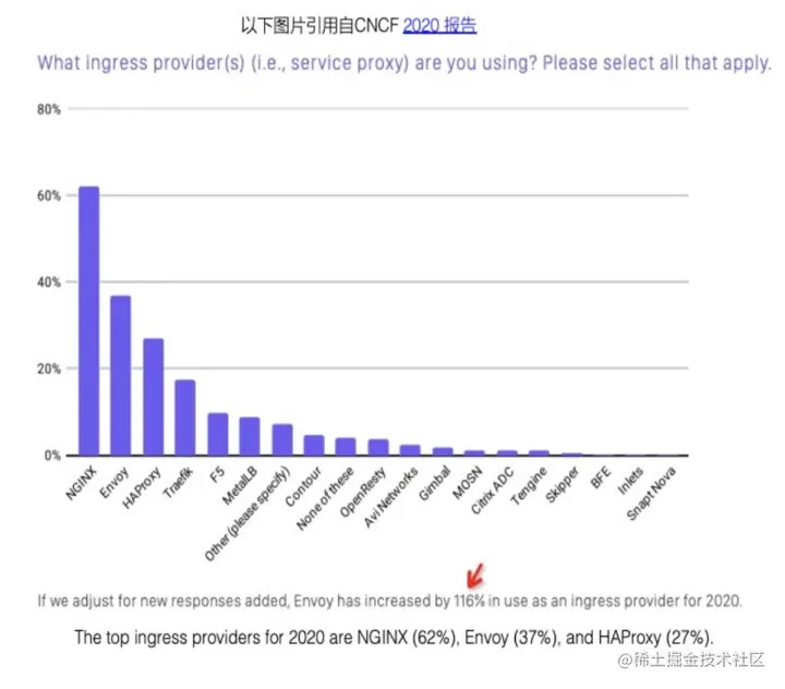 2020年,37% Ingress 实现选择 Envoy(比 2019 年增加了 116%),大量公司基于 Envoy 构建下一代网关技术(引自 CNCF)