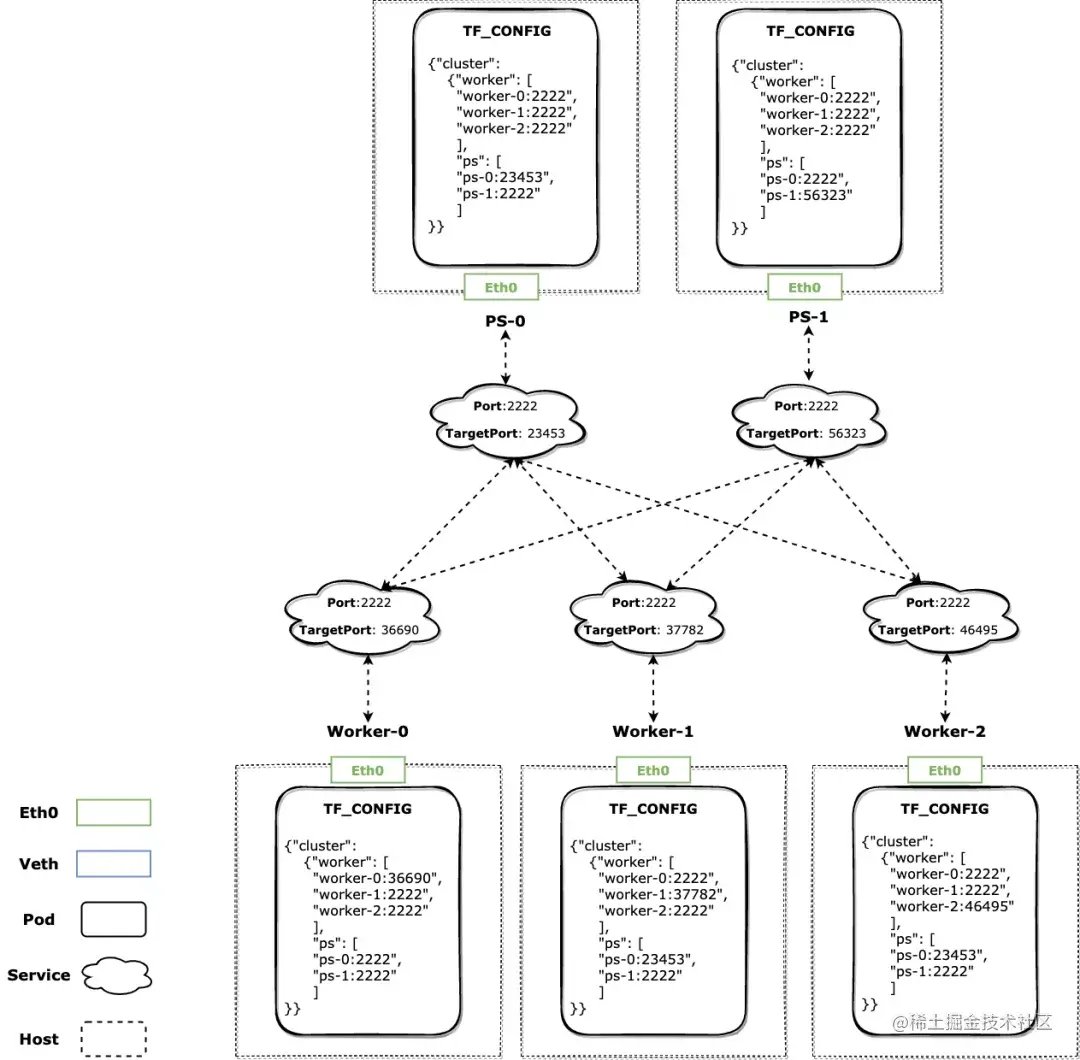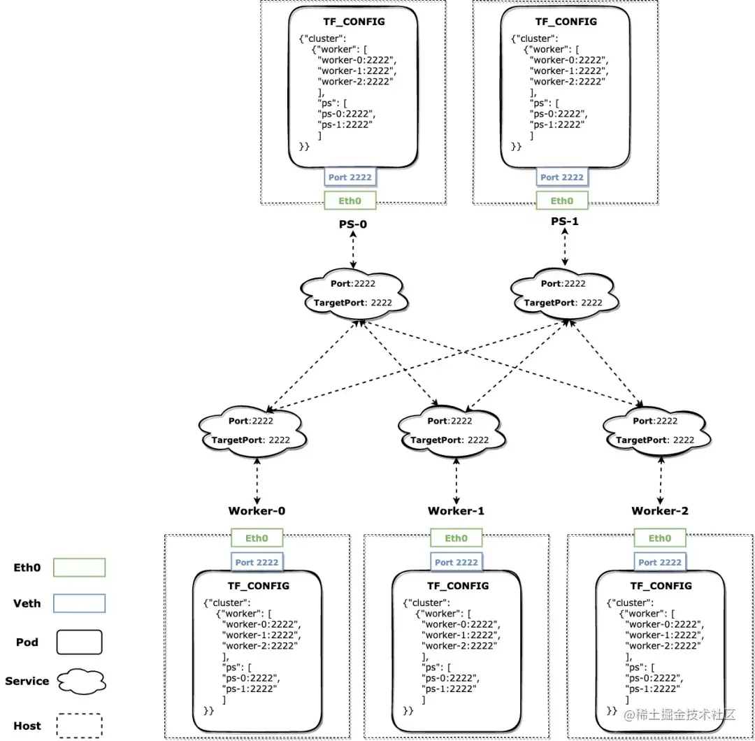 我们以 Tensorflow 作为主机网络的例子,因为它的 Cluster Spec 复杂性更具代表性,但 KubeDL 的内置工作负载(如 PyTorch,XGBoost 等)我们也都针对其框架的行为实现了对应主机网络模式的网络拓扑设置。