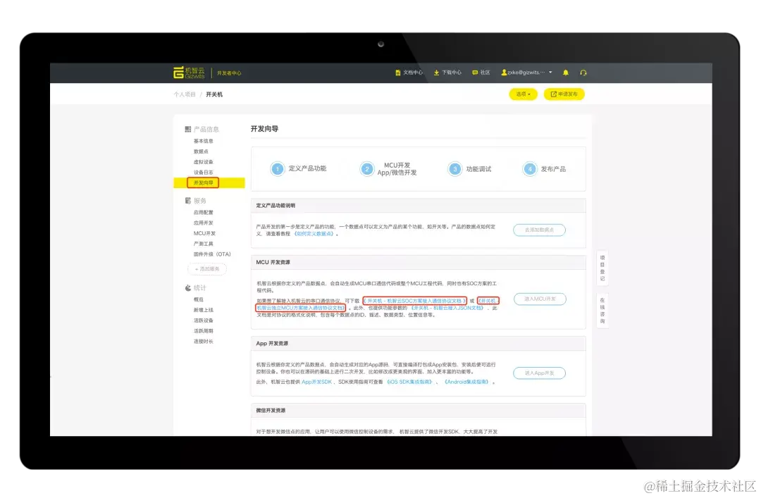 如图所示,点击开发者中心“开发向导”,找到MCU 开发资源,即可查看云端根据定义的数据点自动生成的协议。
