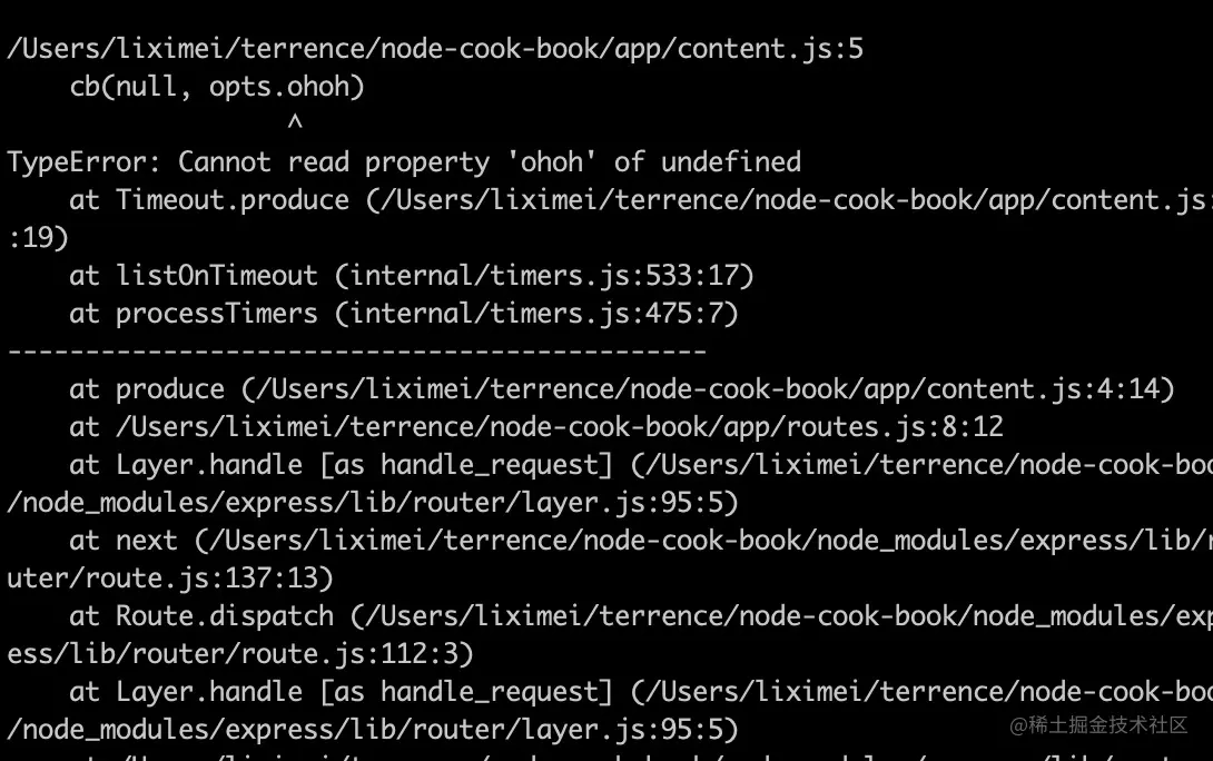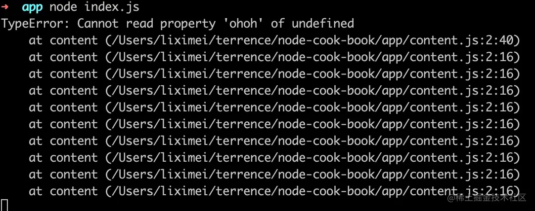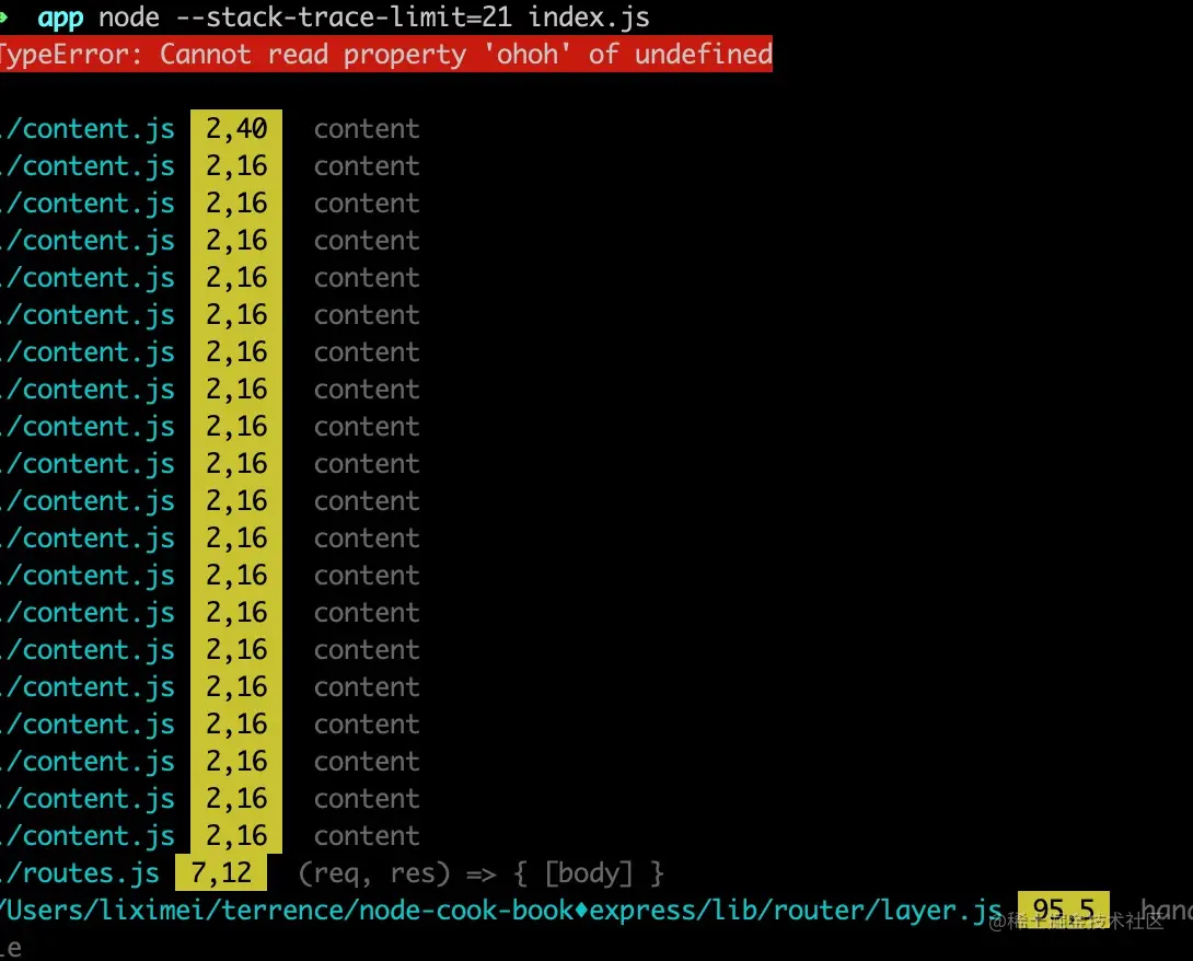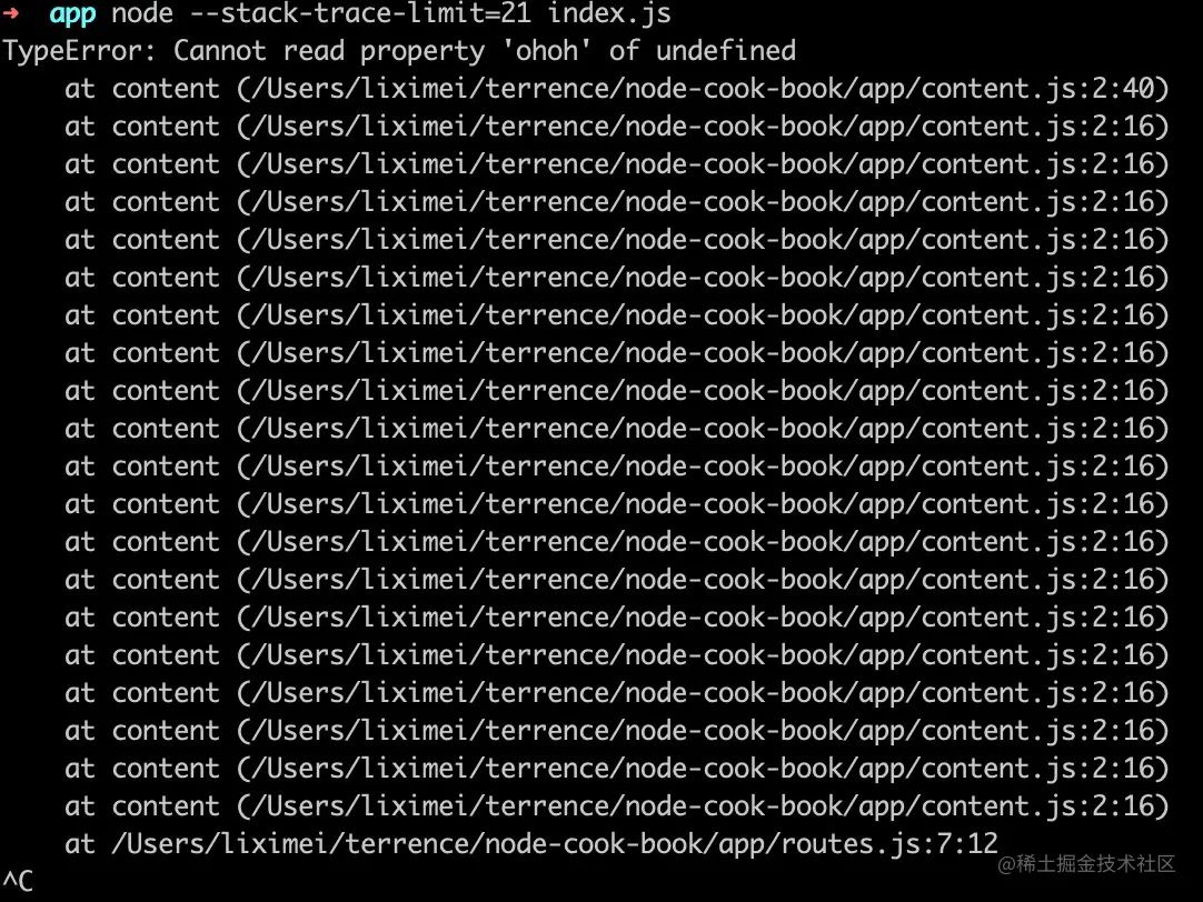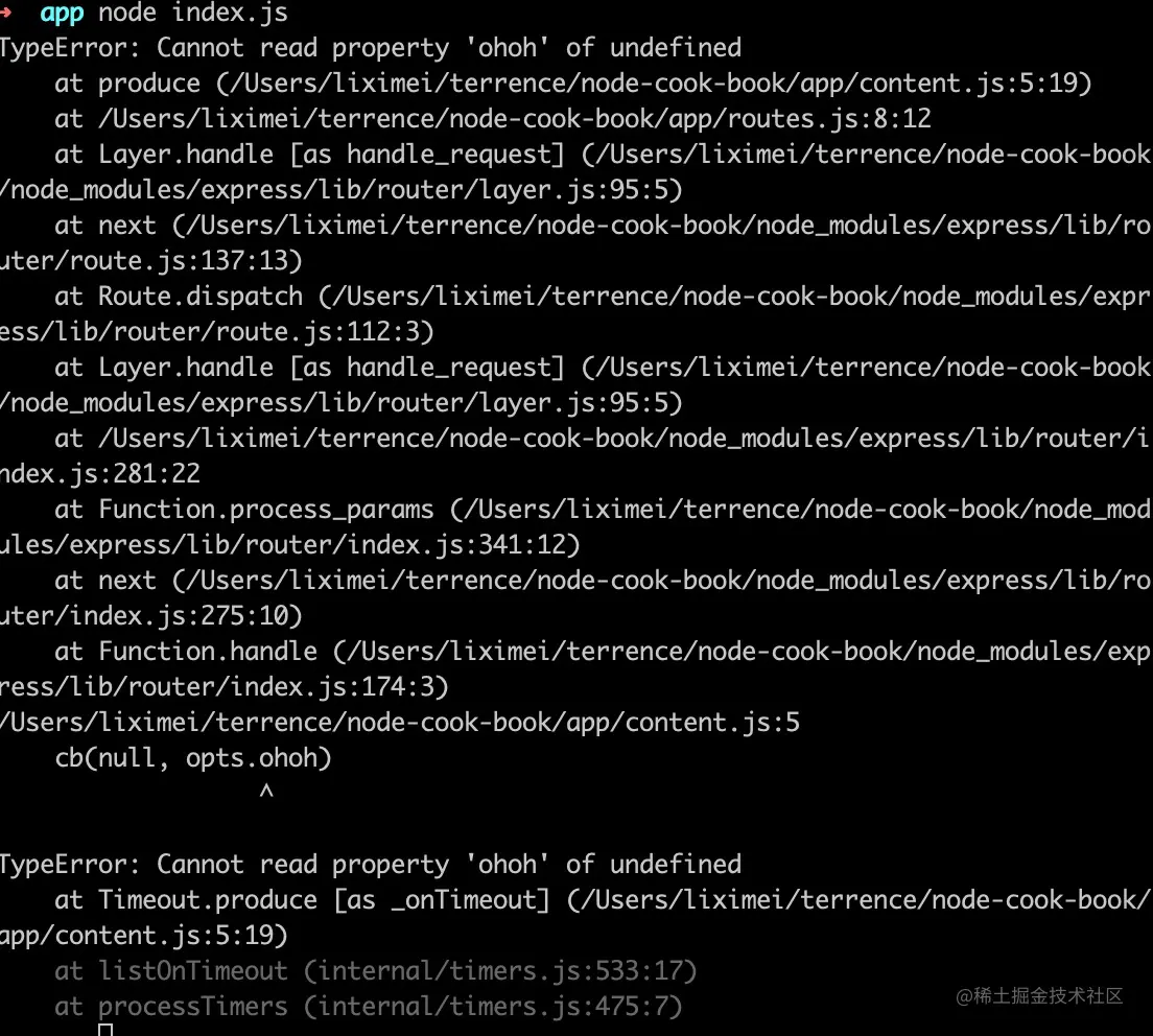 浏览器中打开localhost:3000,我们可以在终端窗口中看到栈追踪记录。