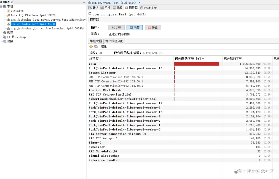 程序能够正常执行结束,看样子使用的内存真的比线程少很多。上面我故意使每个协程结束的时间拖得很长,这样我们就可以在运行过程中使用Java VisualVM查看内存的占用情况了: