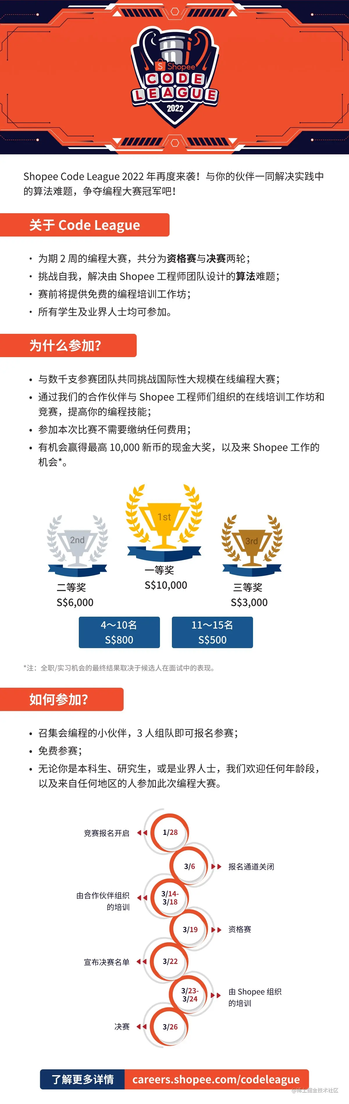 比赛报名将于 2022 年 3 月 6 日截止,集结 3 人小队一起来参与挑战吧:Shopee Code League 2022