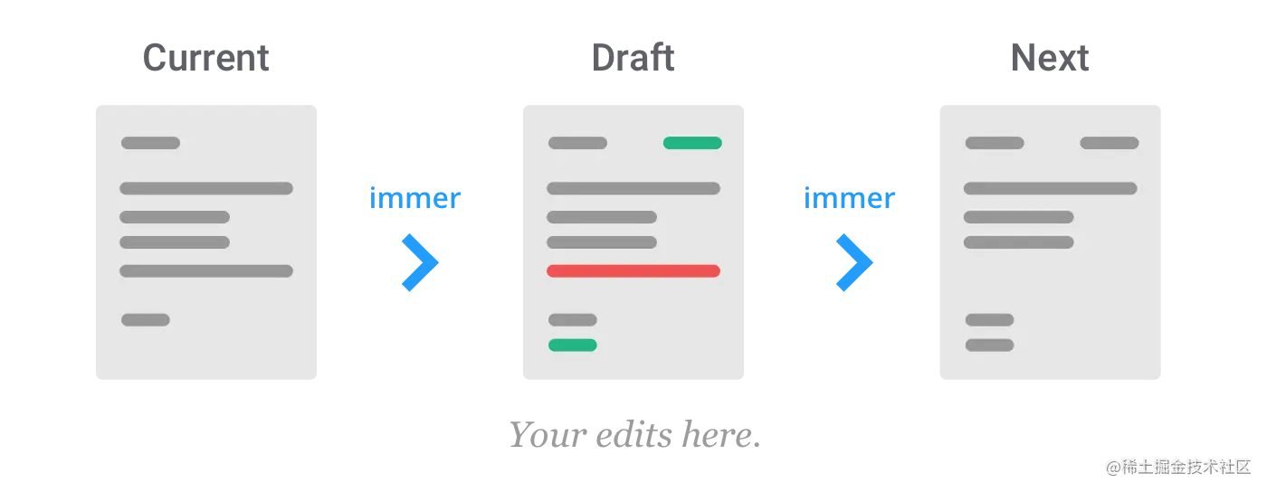 Javascript 在语言层没有实现不可变数据,需要借助第三方库来实现。Immer.js 就是其中一种实现(类似的还Immutable.js)。