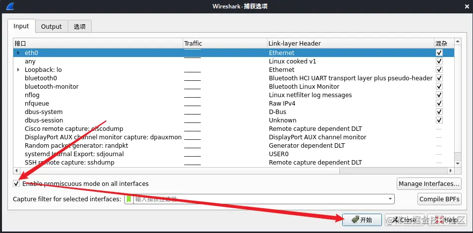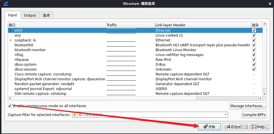 在选项设置界面中的“ 输出 ”设置栏的左下方勾选“ 在所有接口上使用混杂模式 ”