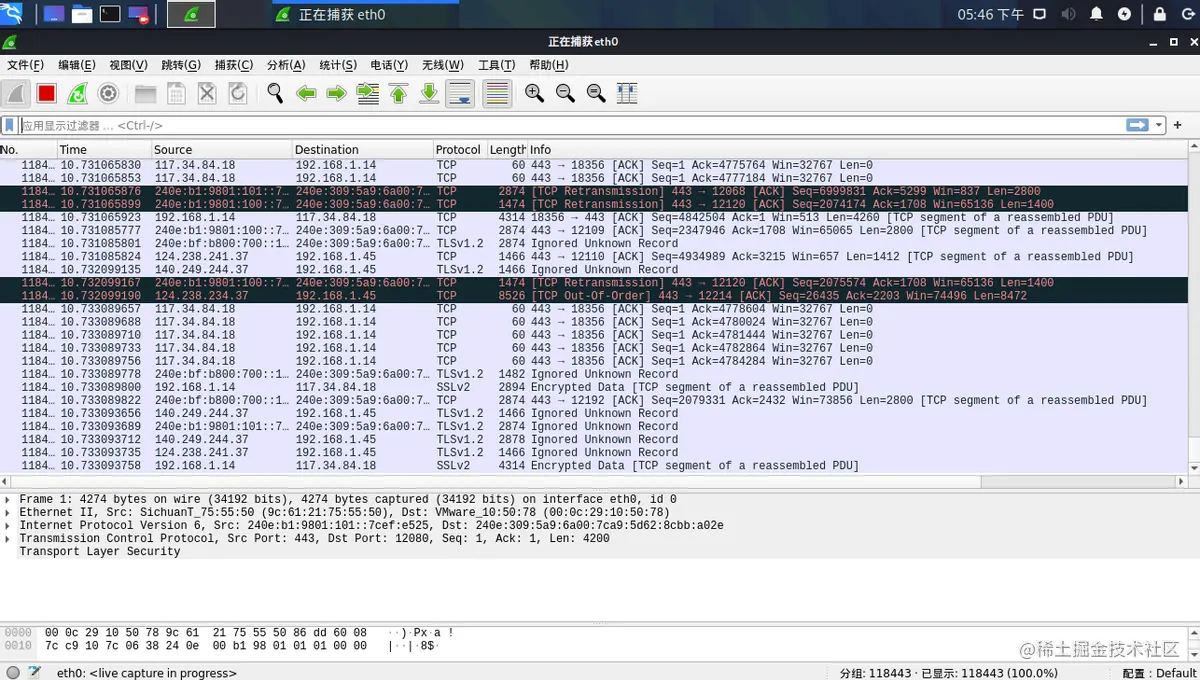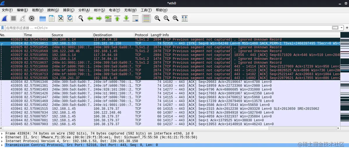 我们开启混淆模式来做一下感受,我们再次捕获---在所有接口上使用混杂模式就可以直接进行抓包