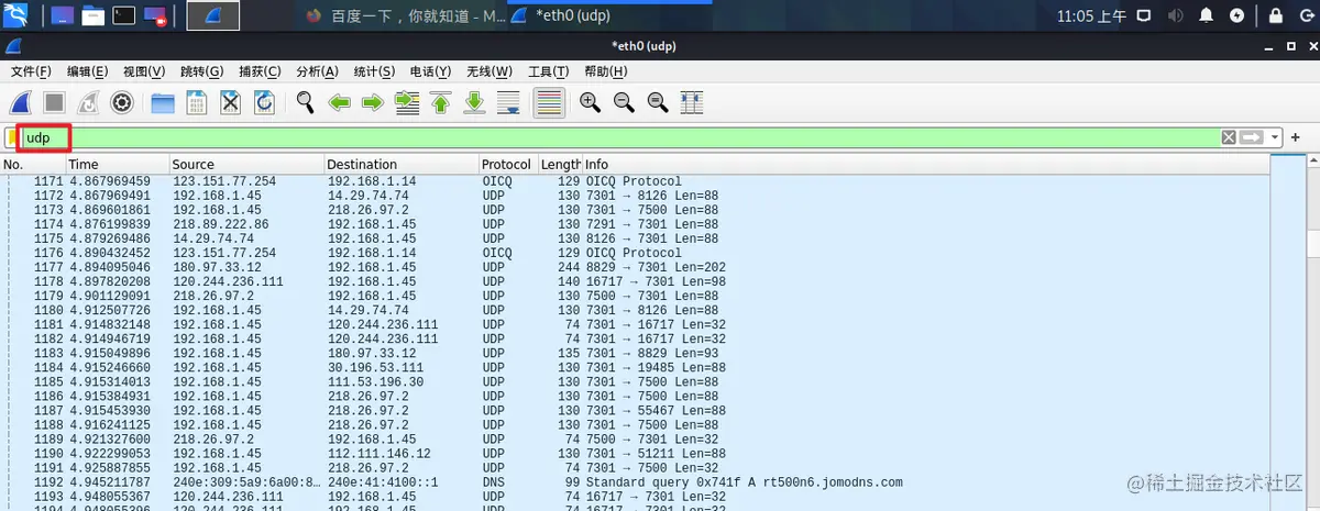 我们使用过滤器输入“udp”以筛选出udp报文。但是为什么输入udp之后出现那么多种协议呢?原因就是oicq以及dns都是基于udp的传输层之上的协议