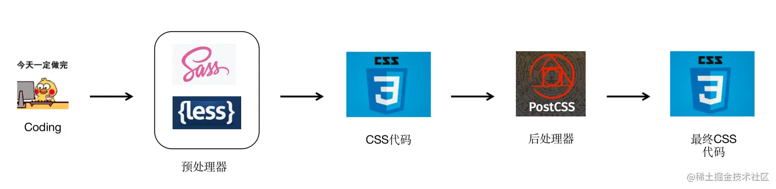 为了给CSS提供更强大的功能(嵌套、变量、运算等)、使其更易于维护,诞生了Sass、Less、Stylus等CSS预处理器。开发者可以使用这些工具提供的更便捷的语法和特性进行开发,预处理器则负责将代码编译为CSS,从而达到提供样式的目的。