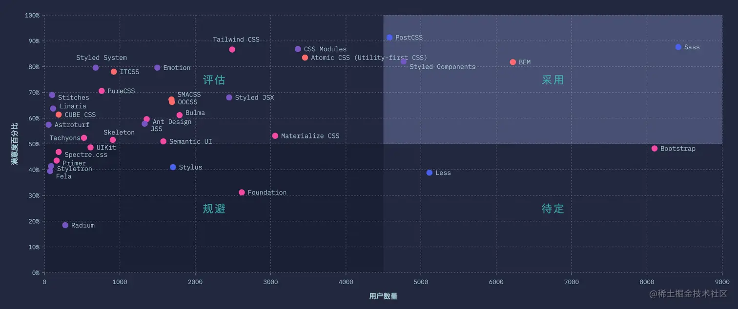 从The State of CSS 2020: 技术调研中我们可以得知当前主流CSS工具的用户数量与满意率数据(样本数量1万+,仅用于参考),其中分为了4个象限: