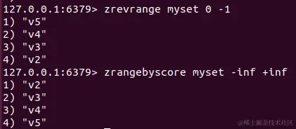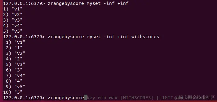 zrangebyscore:排序, -inf:负无穷,+inf:正无穷,也可以返回某个区间的范围内的元素