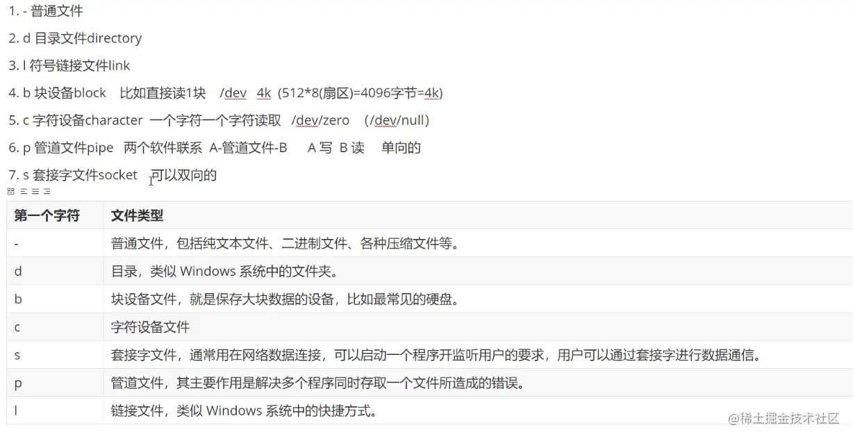 | b: | 块文件,block 块设备文件,就是保存大块数据的设备,比如最常见的硬盘。 |