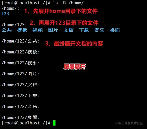 - -R:以递归( Recursive )的方式显示指定目录及其子目录中的所有内容