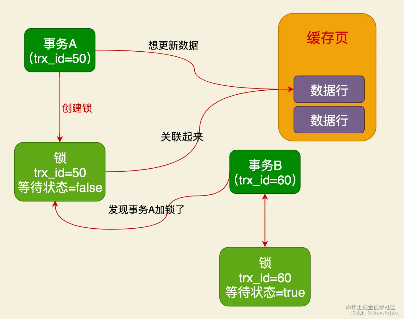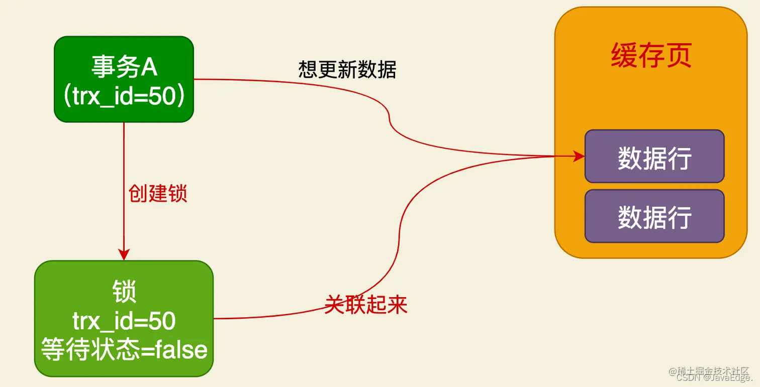 有个事务要来更新一行数据,他会先看这行数据有没有人加锁?看到没人加锁,该事务就会创建一个锁,包含自己的trx_id和等待状态,然后把锁跟这行数据关联在一起。