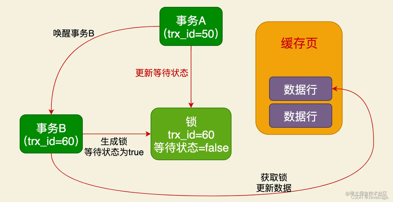 事务A这时更新完了数据,就会释放锁。锁一旦释放,他就会去找,此时还有无别人对这行数据也加锁了呢?他发现事务B也加锁了。于是,就会把事务B的锁里的等待状态修改为false,然后唤醒事务B继续执行,此时事务B就获取到锁了: