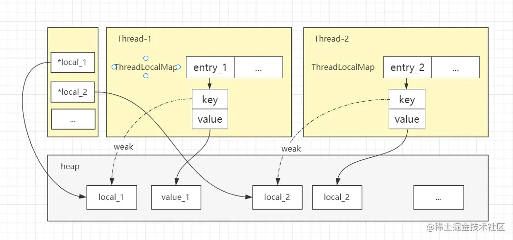 Map接口,JDK自实现的简易Map Entry继承自WeakReference,对应的Key是弱引用Key为ThreadLocal实例- 通过开放寻址法解决hash冲突