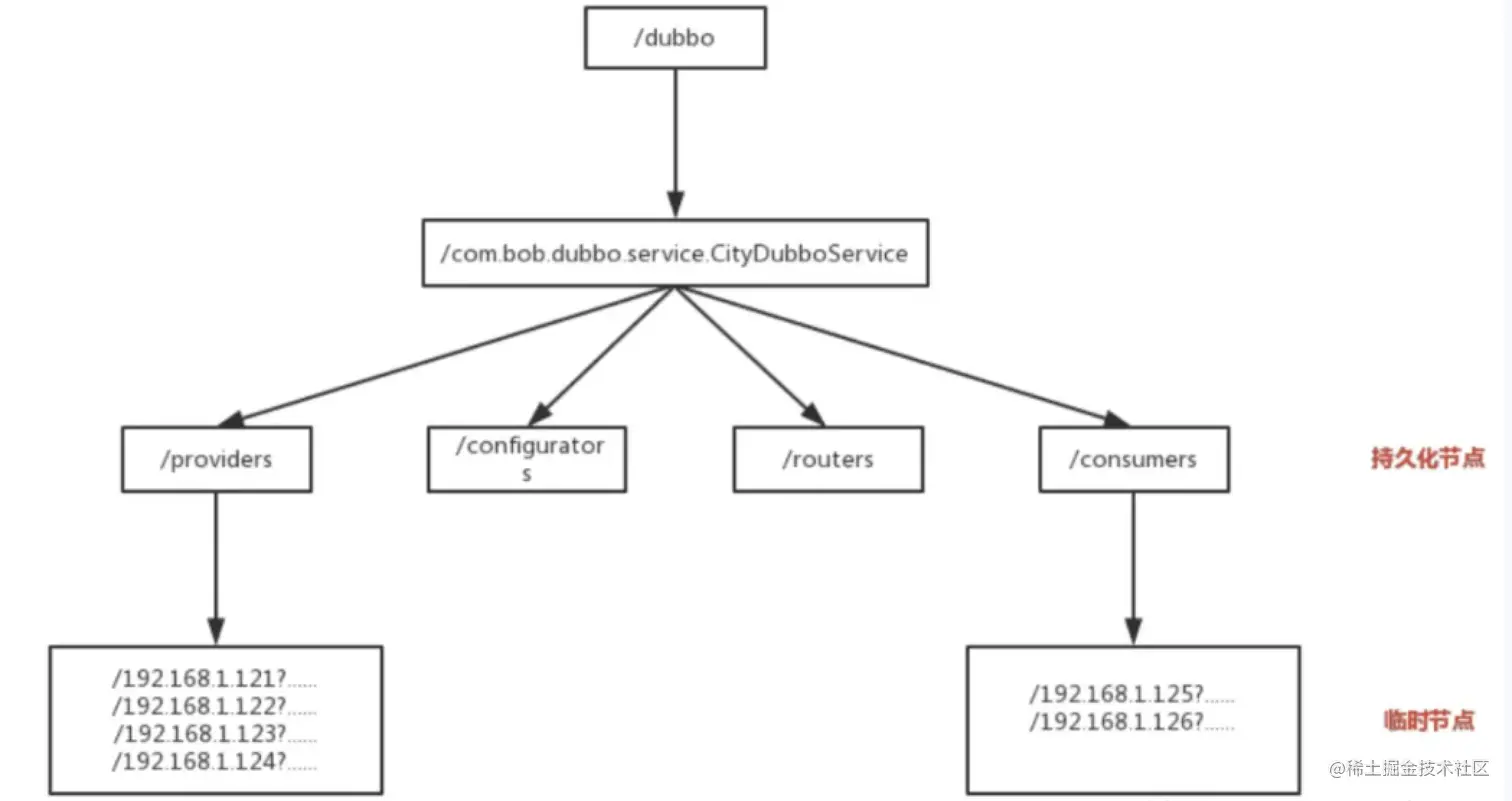 在zookeeper中,进行服务注册,实际上就是在zookeeper中创建了一个znode节点,该节点存储了该服务的IP、端口、调用方式(协议、序列化方式)等。该节点承担着最重要的职责,它由服务提供者(发布服务时)创建,以供服务消费者获取节点中的信息,从而定位到服务提供者真正网络拓扑位置以及得知如何调用。