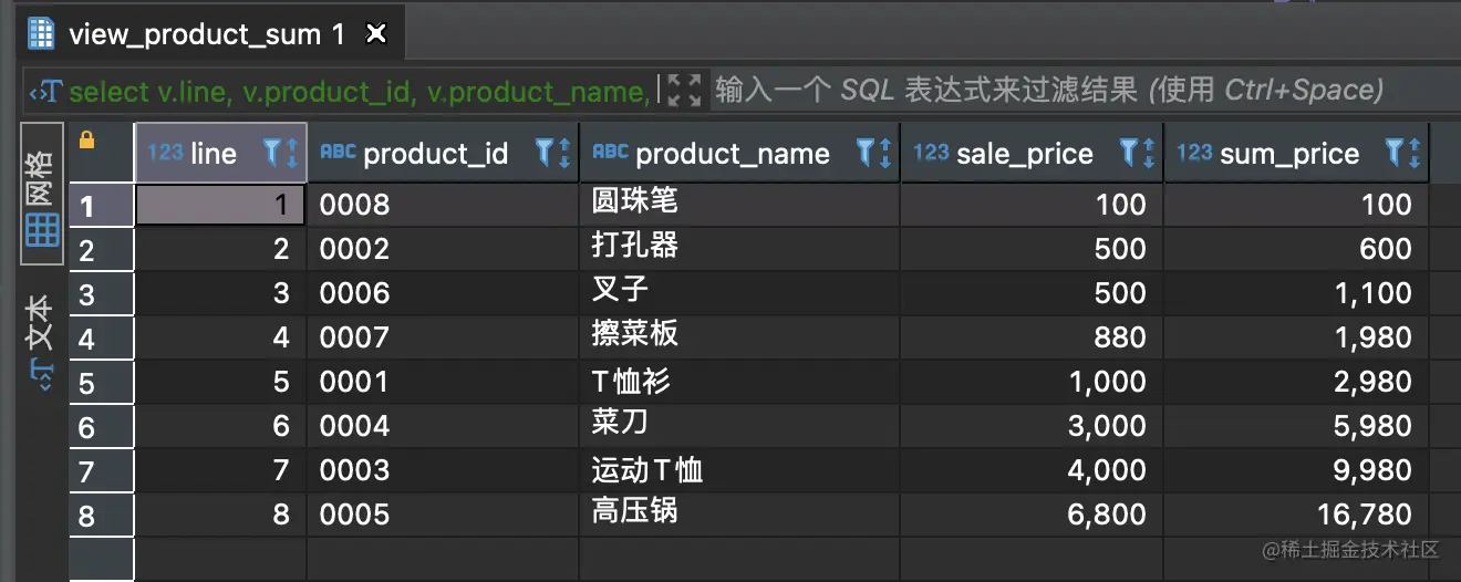 create view view_product_sum(line, product_id, product_name, sale_price)