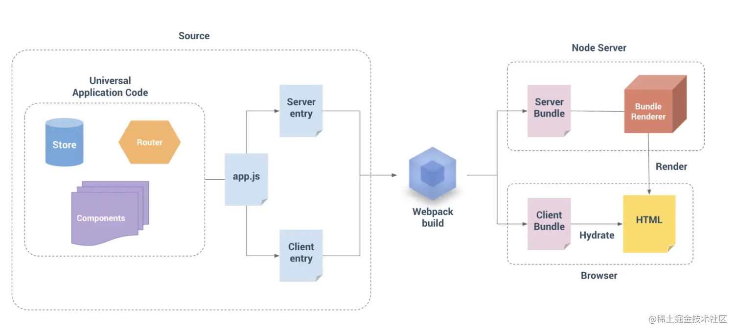 对于 SSR 服务端渲染这个概念稍有经验的开发应该都不陌生,官方文档 Vue SSR 指南 对于什么是服务端渲染、为什么使用服务端渲染以及什么时候使用服务端渲染已经说的很清楚了,结合一张经典的构建过程总结关于 SSR 的基本知识。