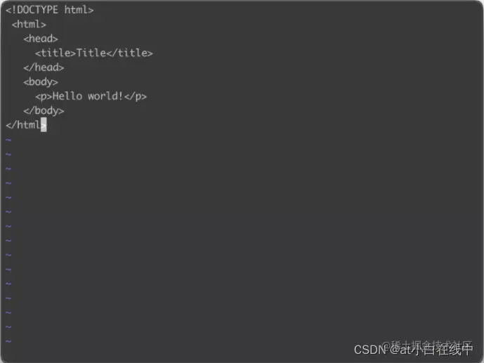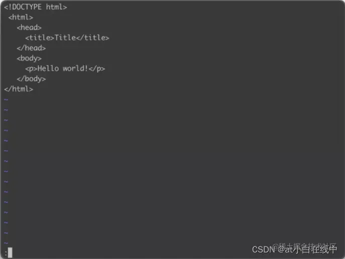 基本上 vi/vim 共分为三种模式,分别是命令模式(Command mode) ,输入模式(Insert mode)和底线命令模式(Last line mode) 。我们边操作边介绍这三种模式:我们执行 vim index.html,如果没有该文件,则会创建文件: