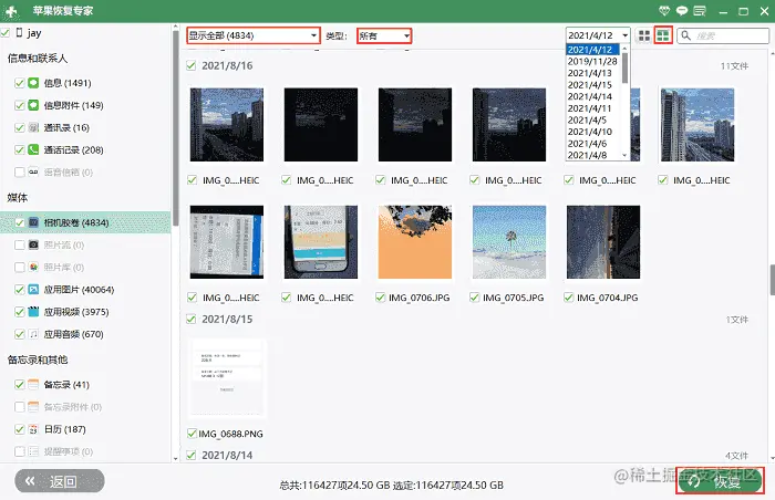 步骤4:可根据的需要选择删除过的那些照片进行恢复,也可以根据下面图中的提示去选择按时间分类,通过日期去找到自己想要的照片。