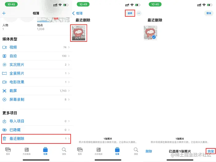 方案一:手机相册自带功能恢复删除的照片