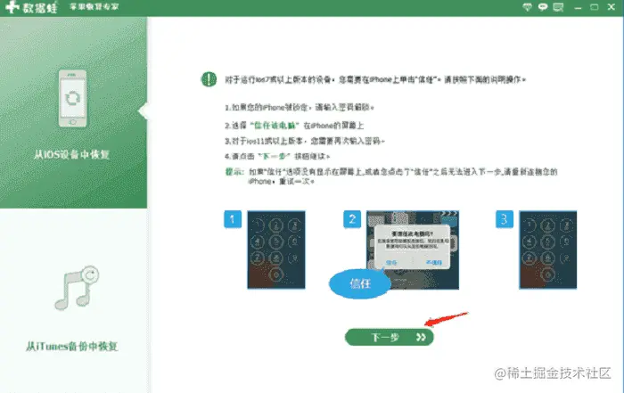 步骤2:根据上面的步骤,进入数据蛙。在连接苹果手机之后,软件会提示你看到苹果手机中弹出的提示。点击“信任”即可,下一步点击电脑上数据蛙页面的开始扫描。