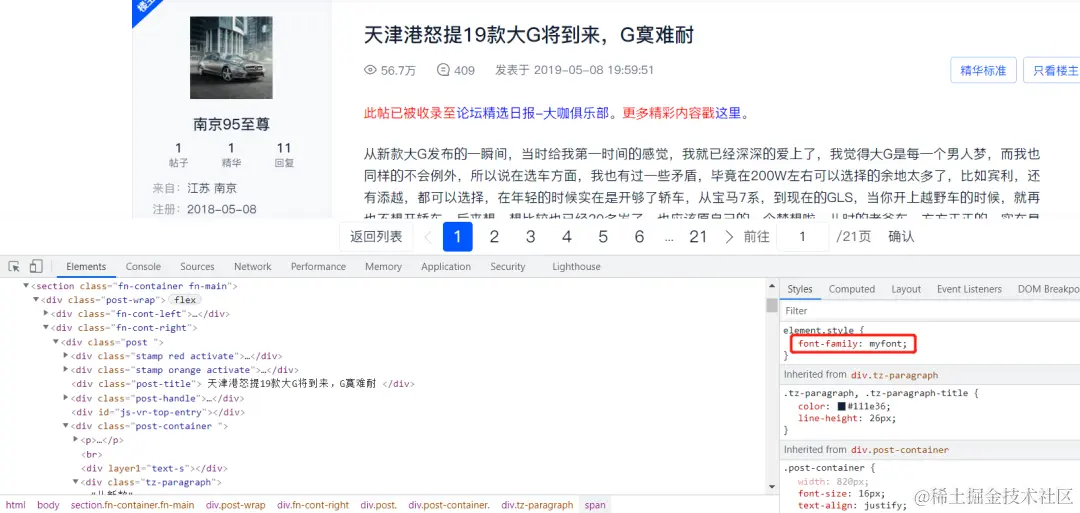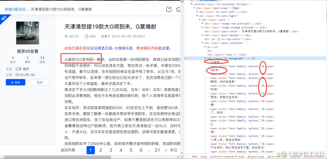 我们今天的采集目标网站是某论坛,当对其文章的文本数据进行采集时,但是发现有字体反爬措施,就是有的文本数据被替换了。