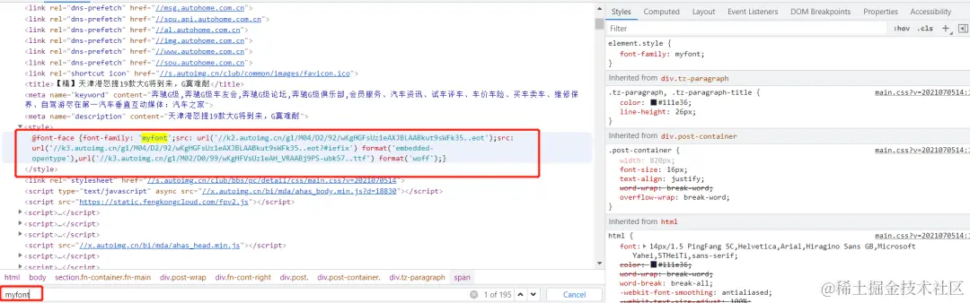 通过检查发现该网站中使用的字体对应的是myfont,这个很明显是网站为了反爬设置的自定义的字体: