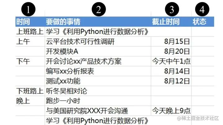 我们再来看每天任务管理清单的第2列要做的事情,这一列列出了当天要做的事情。
