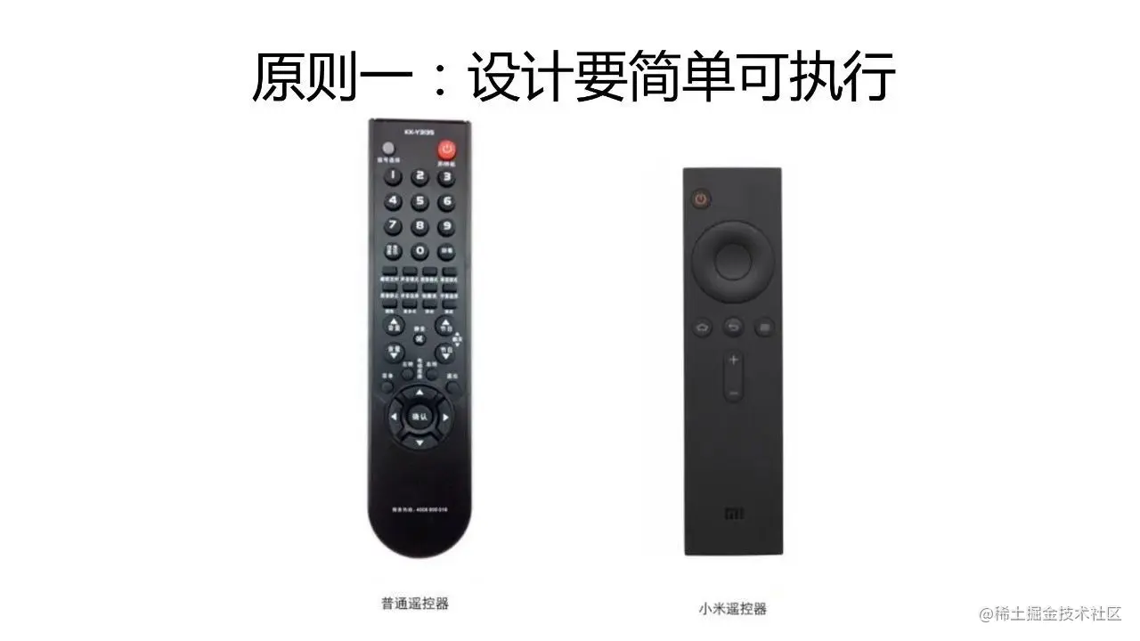 简单原则在产品设计中我们会经常会看到,例如小米决定,把传统电视的“72键”,缩减为11个键。大受欢迎。