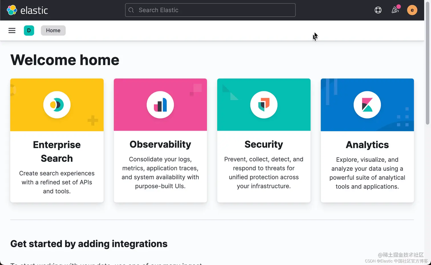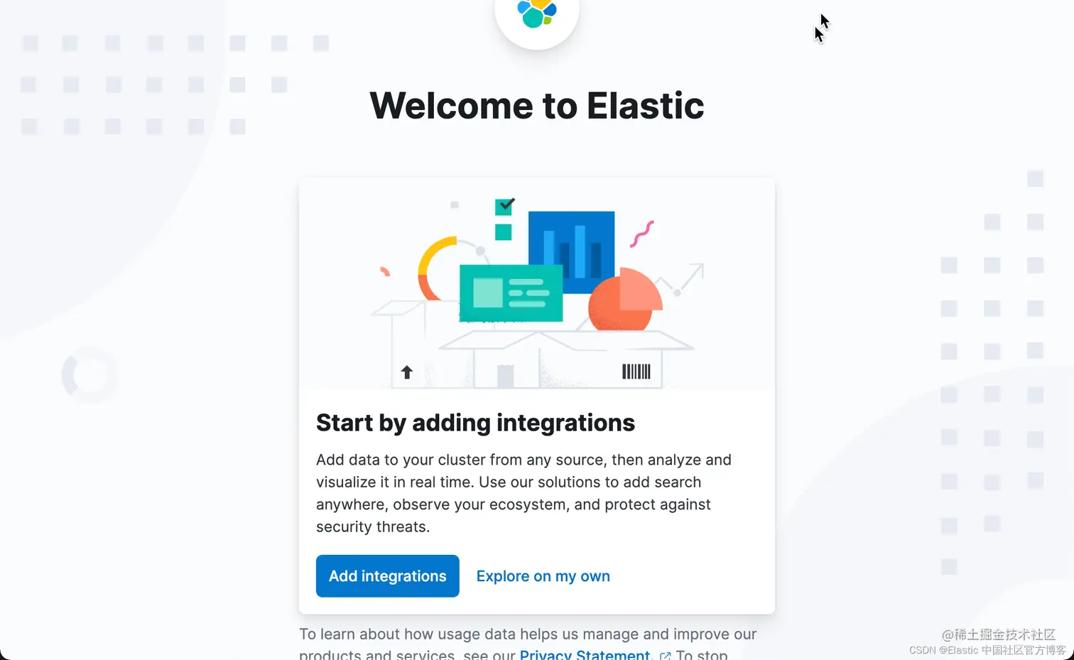 在上面,默认的情况是添加 integrations。这个是用来摄入数据到 Elasticsearch 中的。在今天的展示中,我就先不进行展示了。我们点击 Explore on my own: