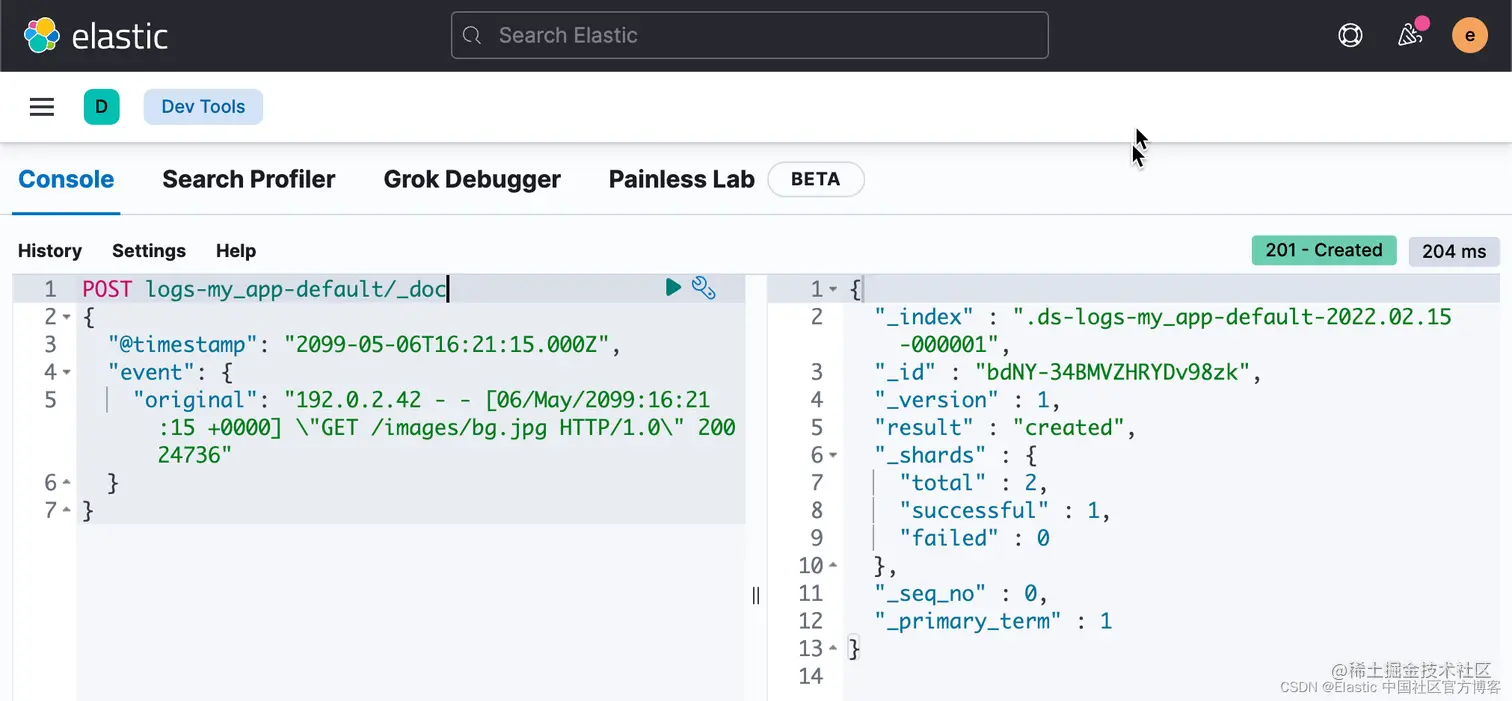 提交以下索引请求以将单个日志条目添加到 logs-my_app-default 数据流。 由于 logs-my_app-default 不存在,请求会使用内置的 logs-- 索引模板自动创建它。