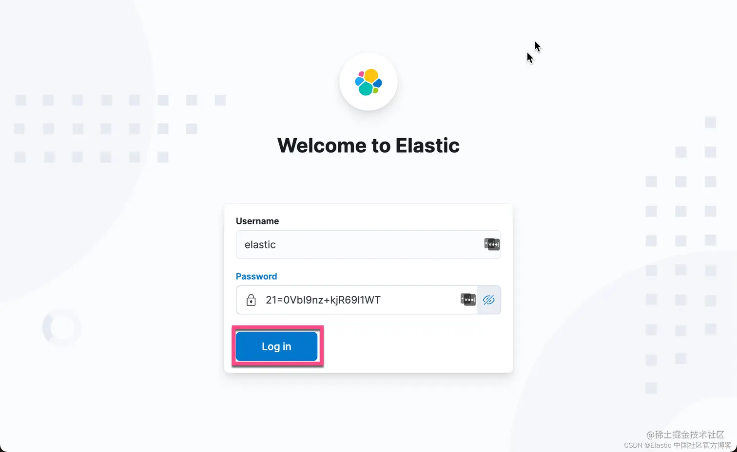等配置完毕后,我们把之前生成的 elastic 超级用户的密码输入进如下的登录页面: