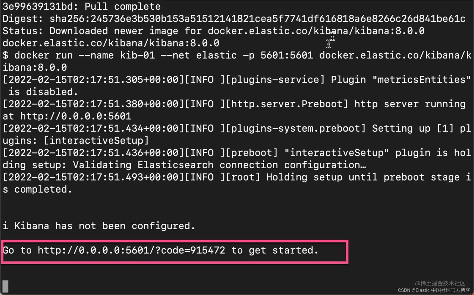 2. docker run --name kib-01 --net elastic -p 5601:5601 docker.elastic.co/kibana/kibana:8.0.0