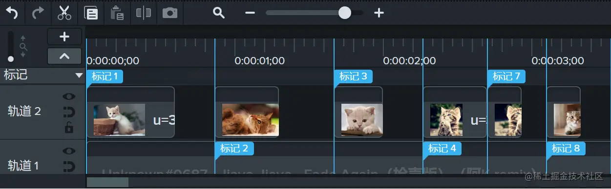 在每一处做标记的地方插入准备好的图片,注意图片和音频不能插入同一轨道。全部插入完成后,需要按照标记调整图片显示的时间。
