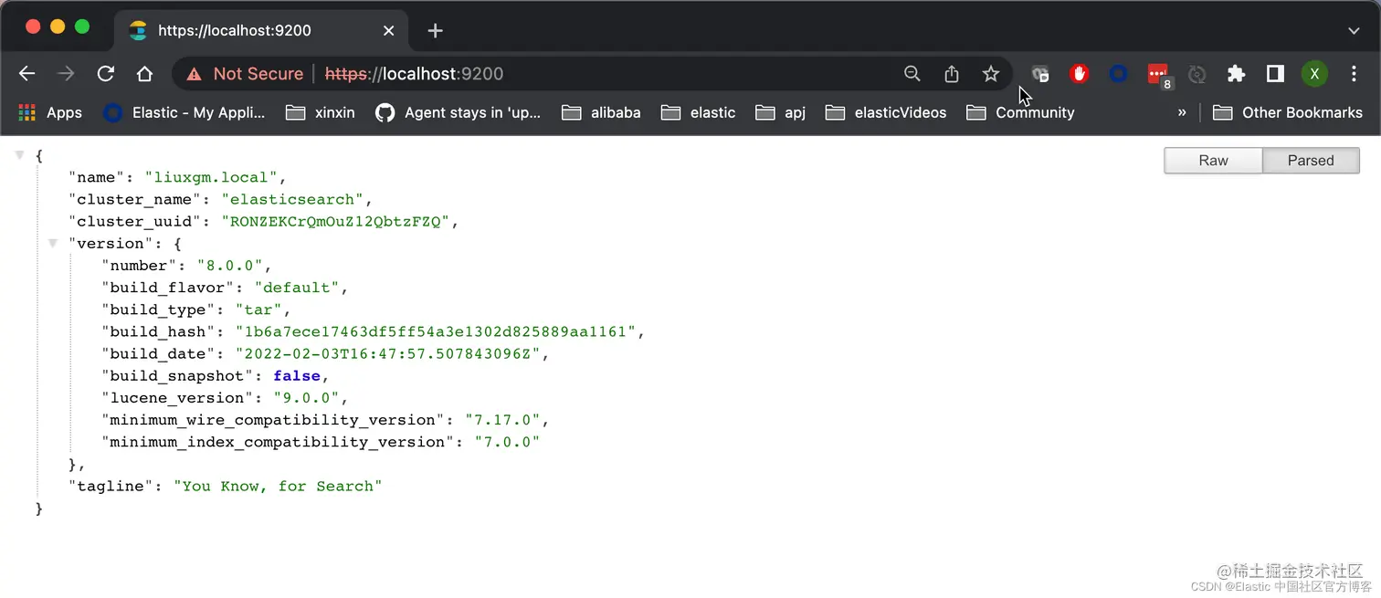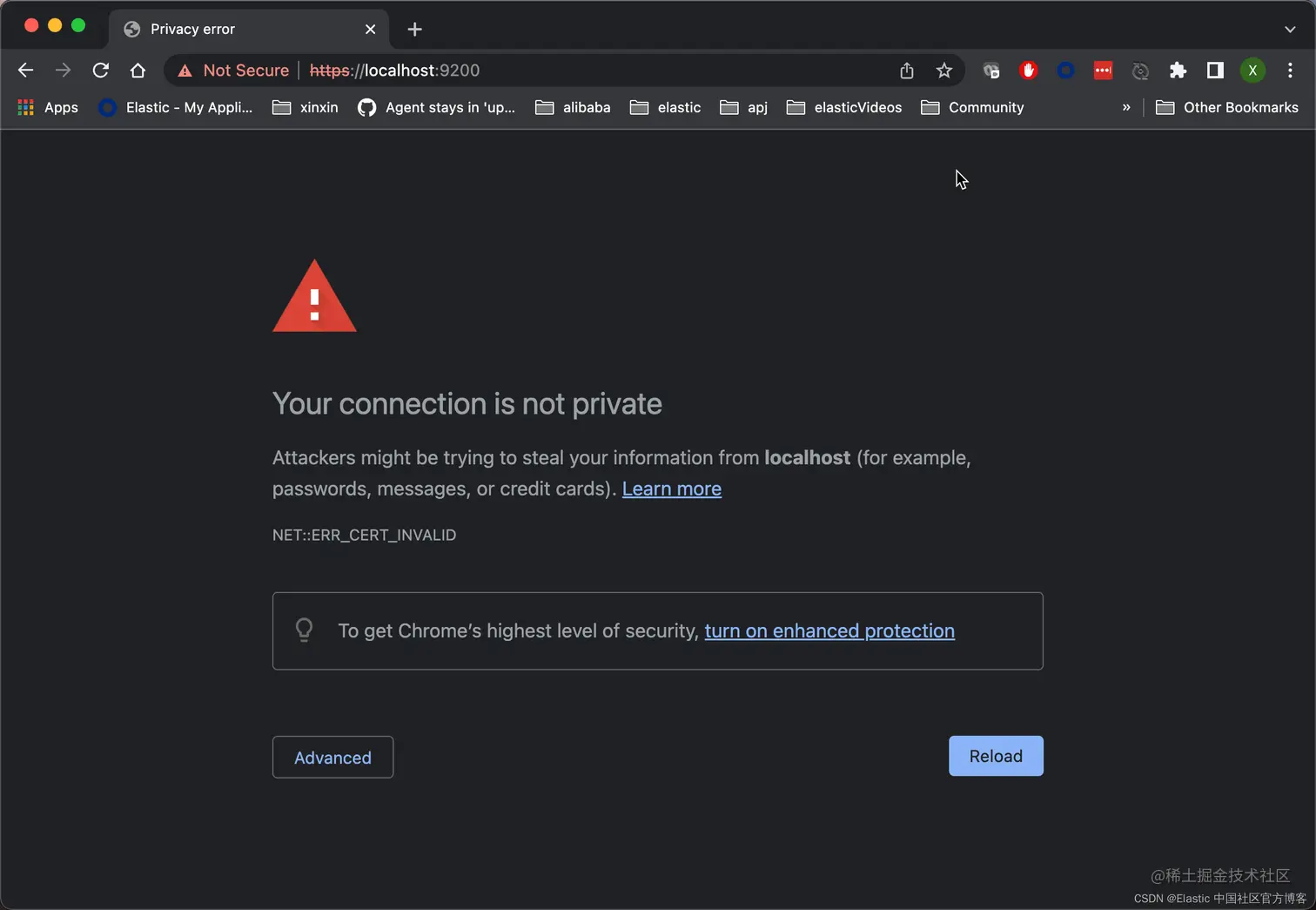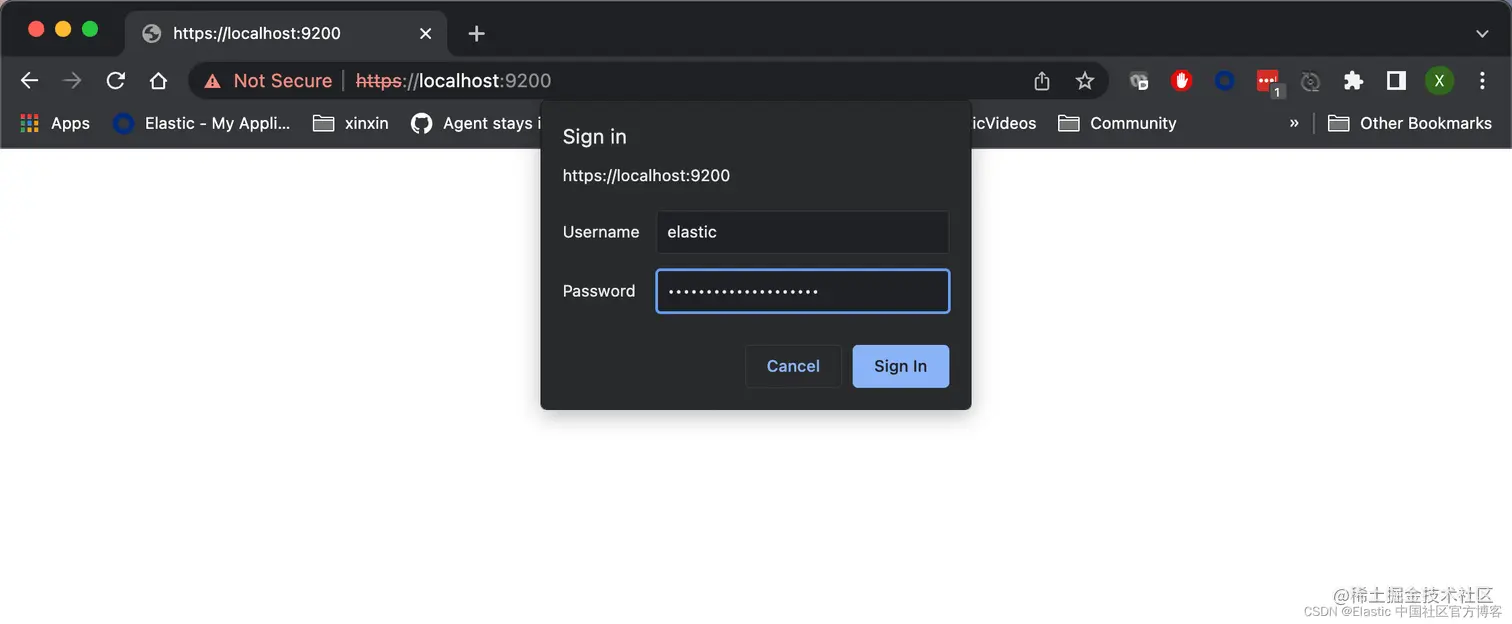 如上所示,我们看到超级用户 elastic 的密码及 Kibana 的 enrollment token (注册 token)。我们需要拷贝它们供以后使用。如果这个时候,我们在 Chrome 下去访问 Elasticsearch 的地址 https://localhost:9200,我们会得到如下的信息: