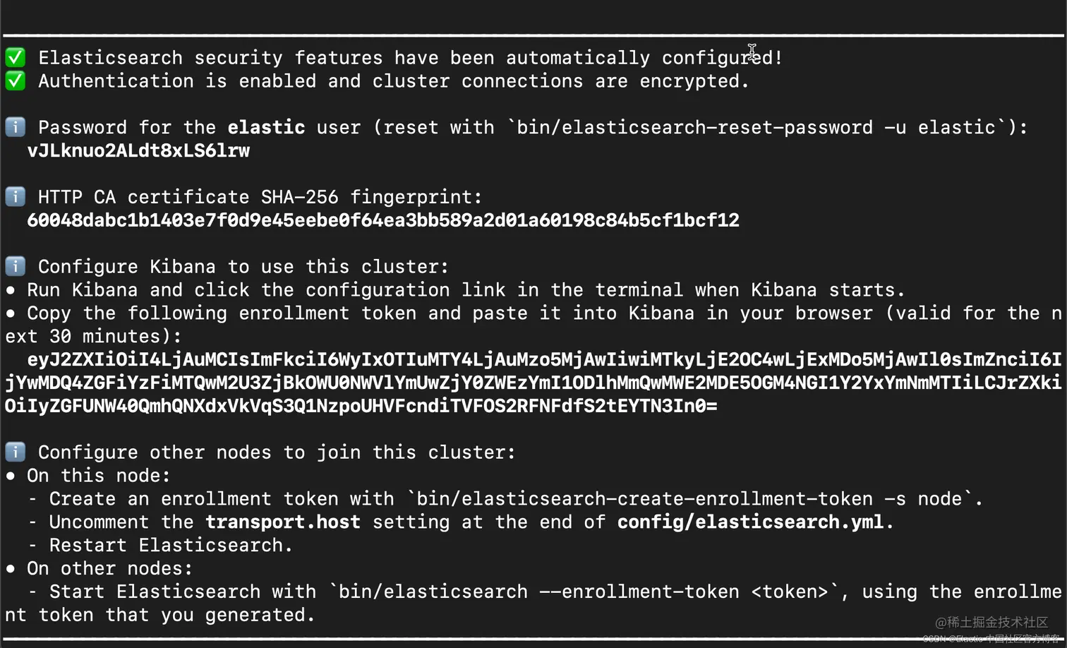 首次下载并运行 Elasticsearch 时,你将收到一个注册令牌和 elastic 超级用户的凭据。 这实际上是你启动 Elastic Stack 并使用我们之前描述的安全功能运行所需的所有信息,因此请妥善保管。你可以在官方的地址找到详细的描述。当我们首次运行 Elasticsearch 时: