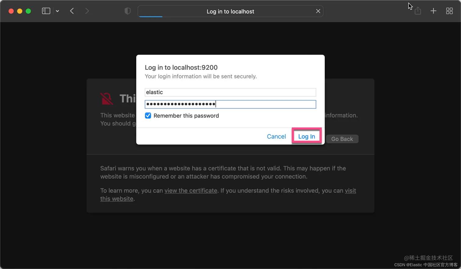 我们拷贝之前在 Elasticsearch 中输出的密码,并输入到上市的 Password 输入框中。点击 Log in: