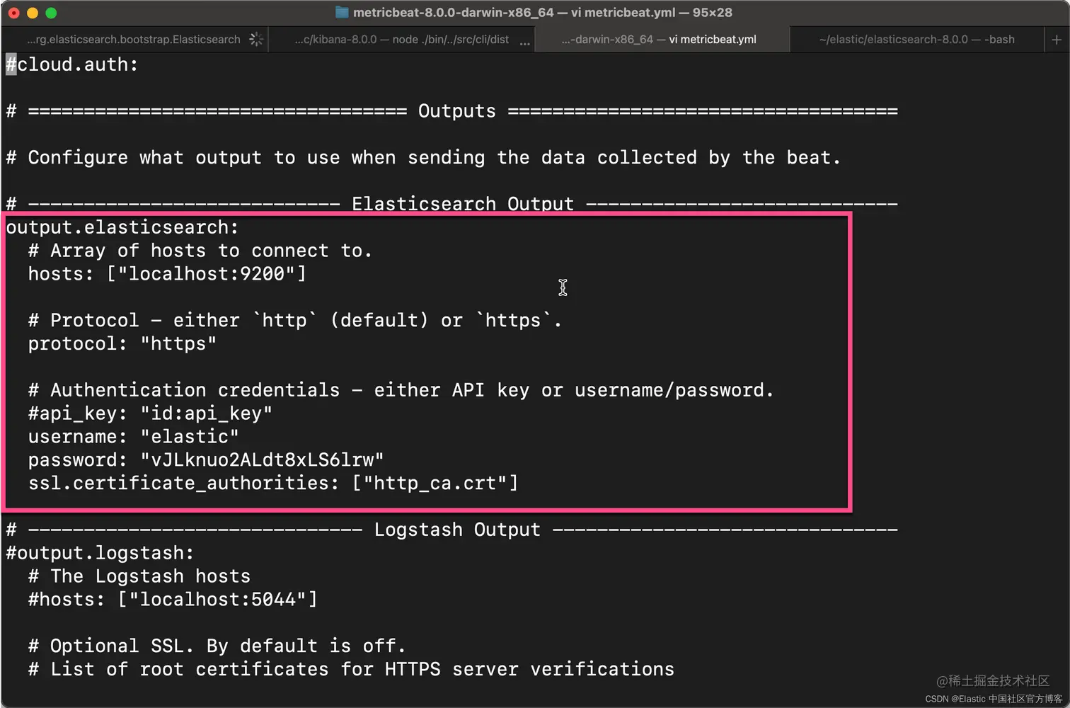 从上面,我们可以看到有一个叫做 http_ca.crt 的文件。接下来我们来配置 metricbeat.yml 文件: