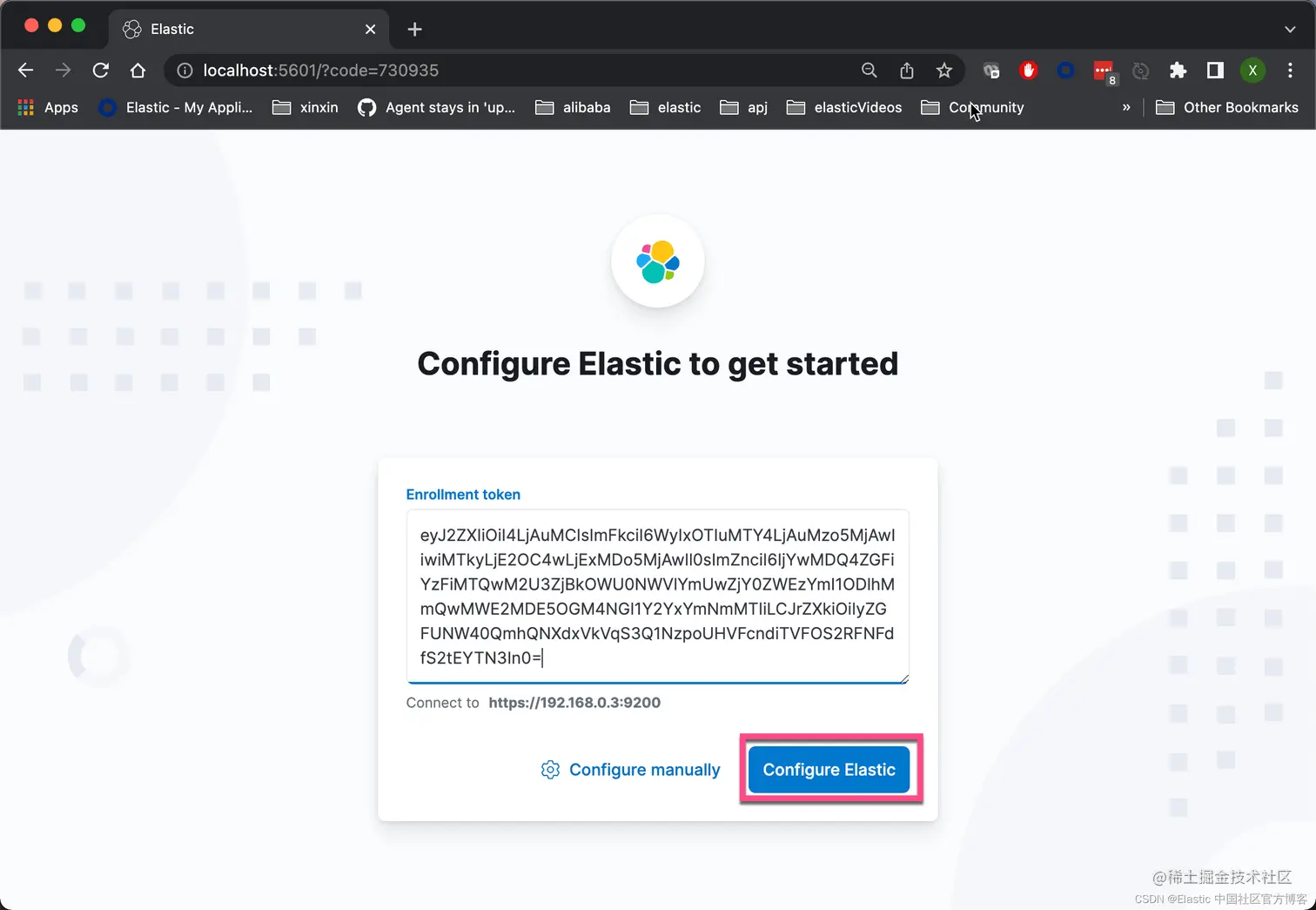 我们把之前的 Elasticsearch 运行输出的 enrollment token 拷贝进来。 点击上面的 Configure Elastic。Kibana 将设置所有内容,无需进行任何配置,并将通过 TLS 连接到 Elasticsearch。