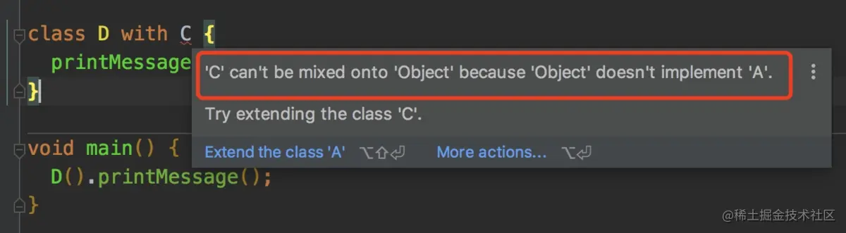 有人可能会说,mixin C on A,那么 C 中的 super 不就是 A 吗,结果应该是 AC 才对啊。这是因为在 with A 和 with C之间还有一个with B,C 里面的 super 其实是 with A,B,所以 B 的 printMessage() 覆盖了 A 的 printMessage(),所以with A,B里面的 printMessage() 是 B 的 printMessage(),所以,输出的结果时 BC。若将 D 的声明改为