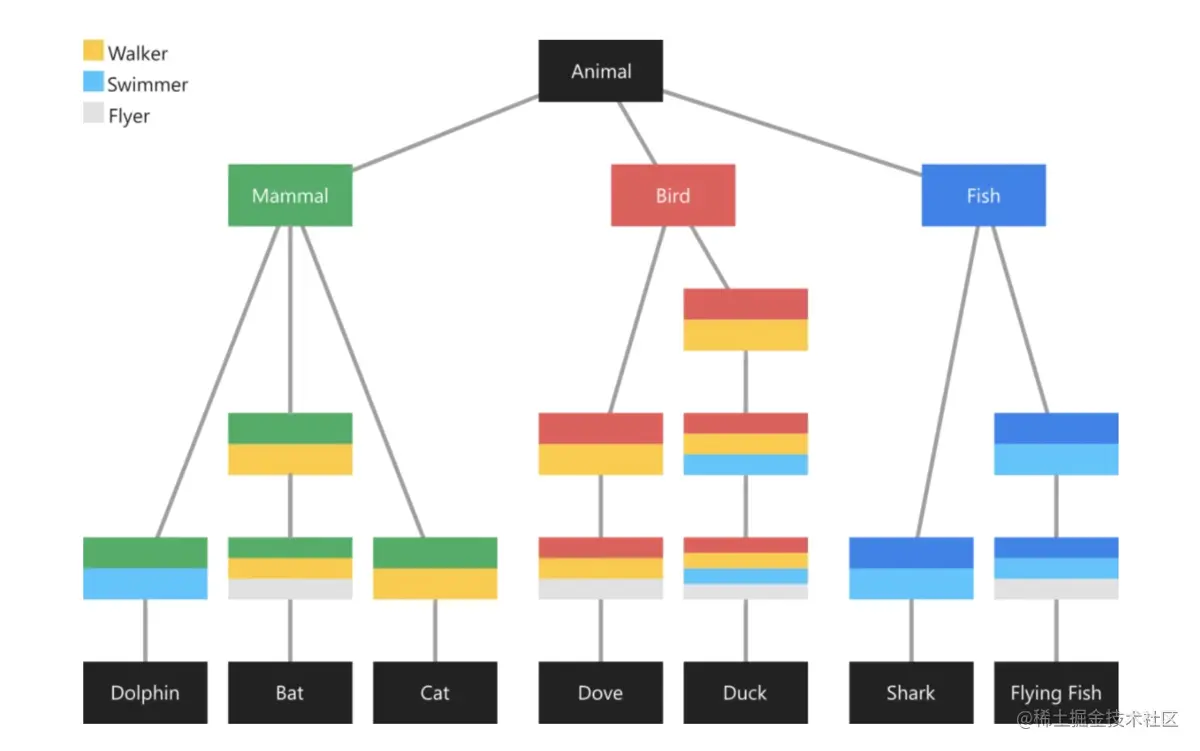 一个名为Animal的超类,它有三个子类:Mammal、Bird、Fish。在他们下面有一些具体的子类,每个子类都有不同的行为,这些行为是walk、swim、fly的子集。有些动物有共同的行为:如猫和鸽子都会行走,但猫不能飞。这些行为与具体的子类都有交集,所以我们无法在他们的父类中实现这些行为。