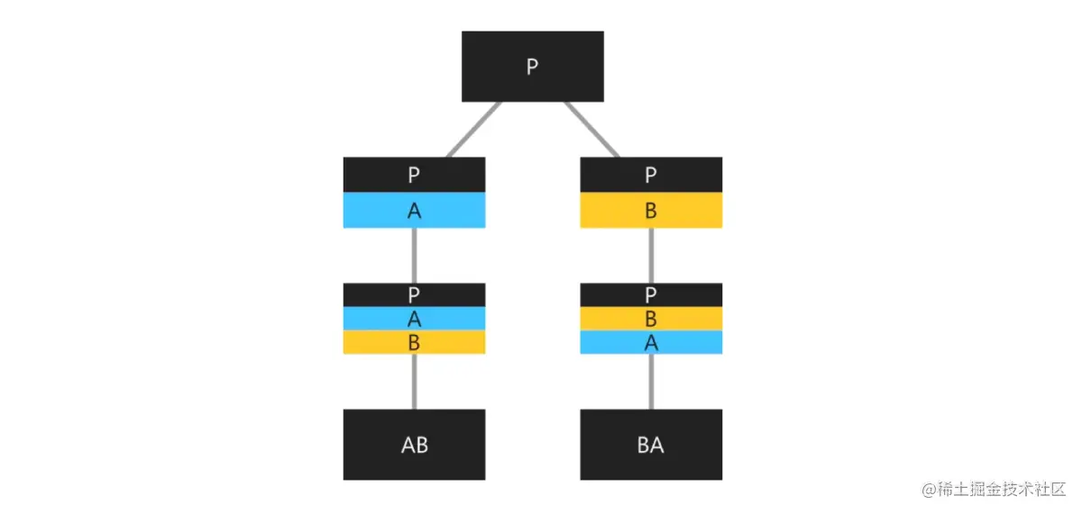 在 AB 和 P 之间创建新类,这些新类是超类 P 与 A 类和 B 类之间的混合类。