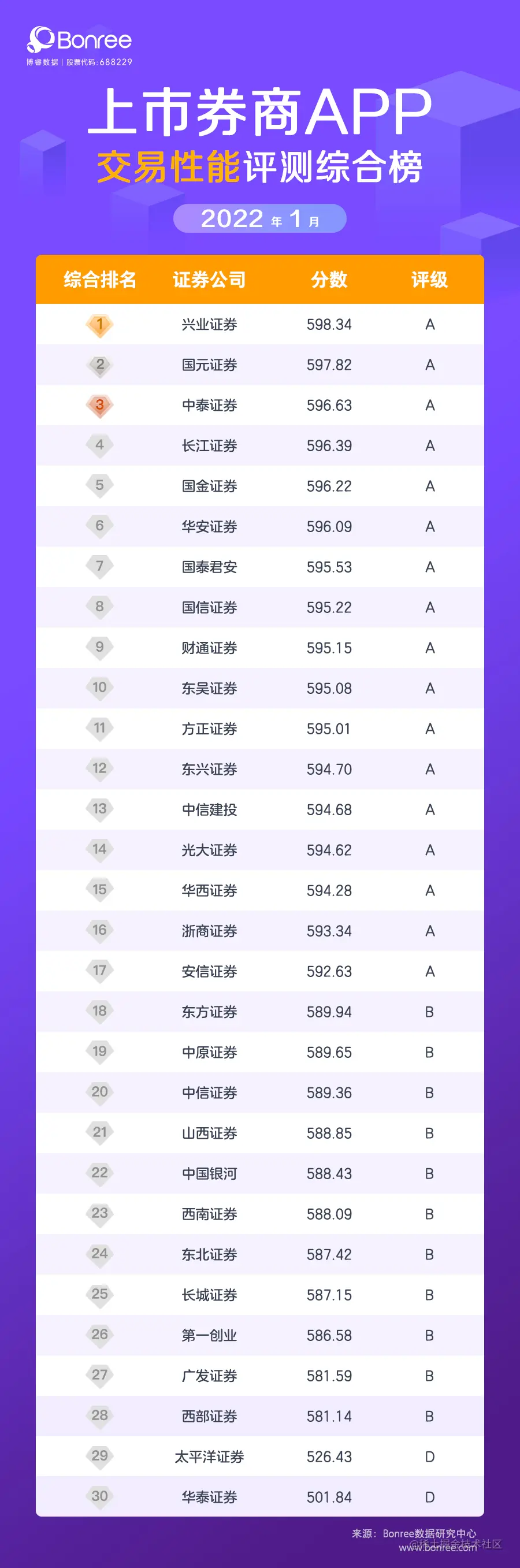 在2022年1月上市券商App交易性能综合评测中,兴业证券再登榜首,国元证券及中泰证券位列第二、第三名。此外,本月A级券商共计17家,较上月减少2家,B级券商11家,较上月增加了3家,D级券商2家。