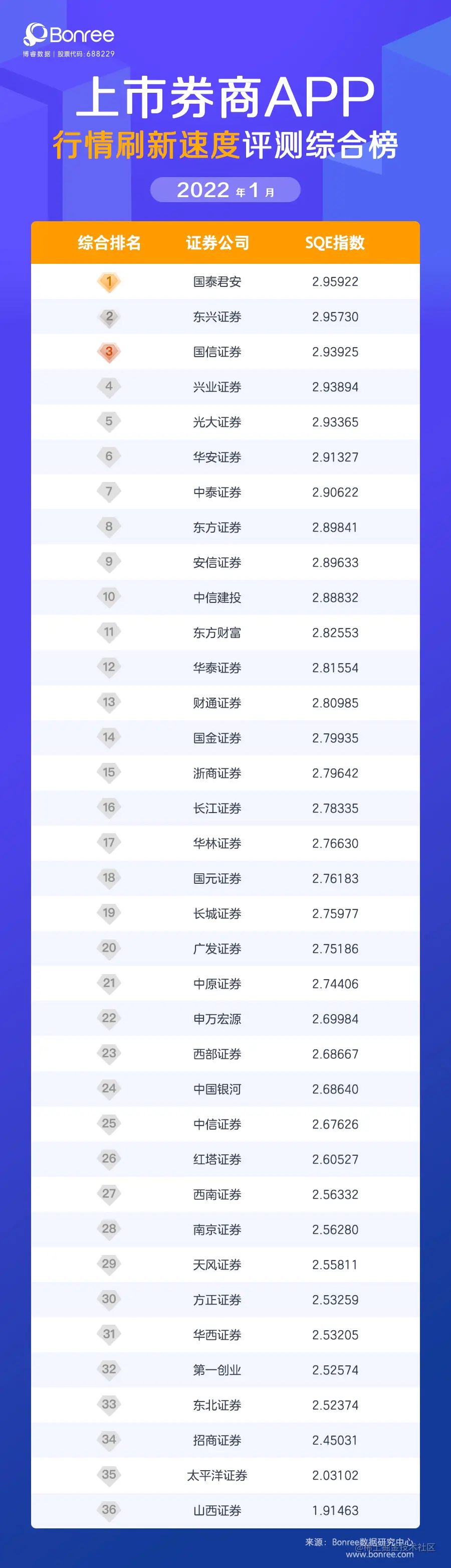 在2022年1月行情刷新速度综合评测榜单中,36家上市券商整体表现稳定。其中,国泰君安继续霸榜,东兴证券及国信证券位列第二、第三名。