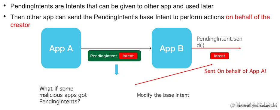 接下来,这个PendingIntent对象可以发送给其他App使用,其他App调用PendingIntent.send时,就能够以PendingIntent源App的身份和权限发送PendingIntent中的base Intent。其他App甚至还可以提供一个新的Intent,对base Intent进行改写。