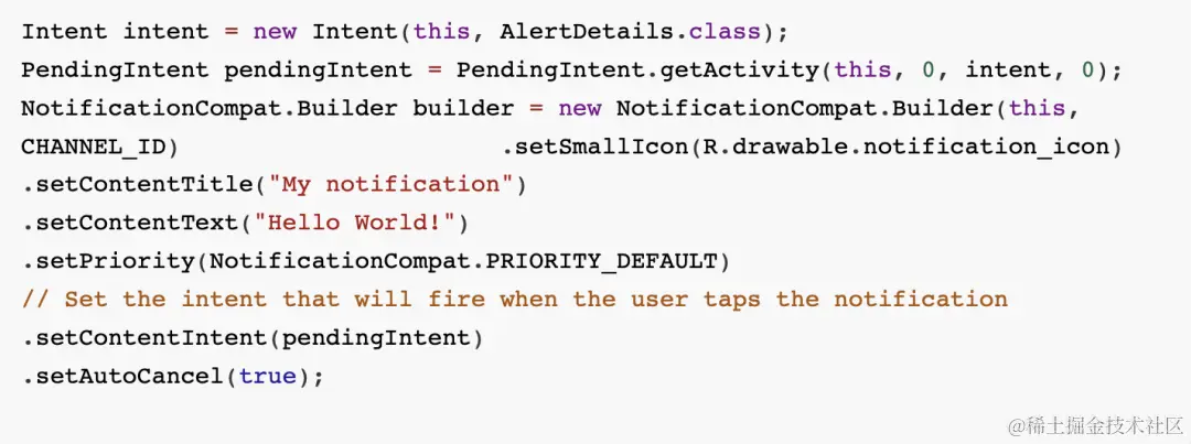 通知在Android系统中应用极为广泛,用于在状态栏中对用户进行提示,几乎为每个App所使用,是安卓开发者最常使用PendingIntent的地方,如下为发送通知的示例代码