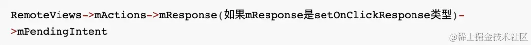 但是拿到RemoteViews以后再获取PendingIntent却颇费周折,因为RemoteViews并未提供公开API来获取其中的PendingIntent。但经过分析,我们发现可以通过反射,按照如下顺序逐次获取隐藏的成员变量mPendingIntent。